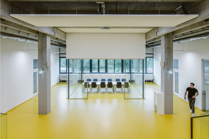 Das Herzstück des Mech-Centers bildet eine SITZRAMPE, welche als Warte-, Kommunikations- und Arbeitsfläche dient. Vis a vis der Sitzrampe befindet sich ein großzügiger Besprechungsraum der variabel genutzt werden kann. Die Sitzrampe und der Besprechungsraum gliedern nach dem Prinzip „RAUM IM RAUM“ die neugestaltende Fläche. Das neue Mech-Center vermittelt OFFENHEIT, HELLIGKEIT, FREUNDLICHKEIT und heißt jeden Besucher willkommen. Die gewählten Farben gelb und blau entsprechen der Corporate Identity des Fachbereichs Maschinenbau und schaffen eine eindeutige IDENTITÄT und Wiedererkennung.
